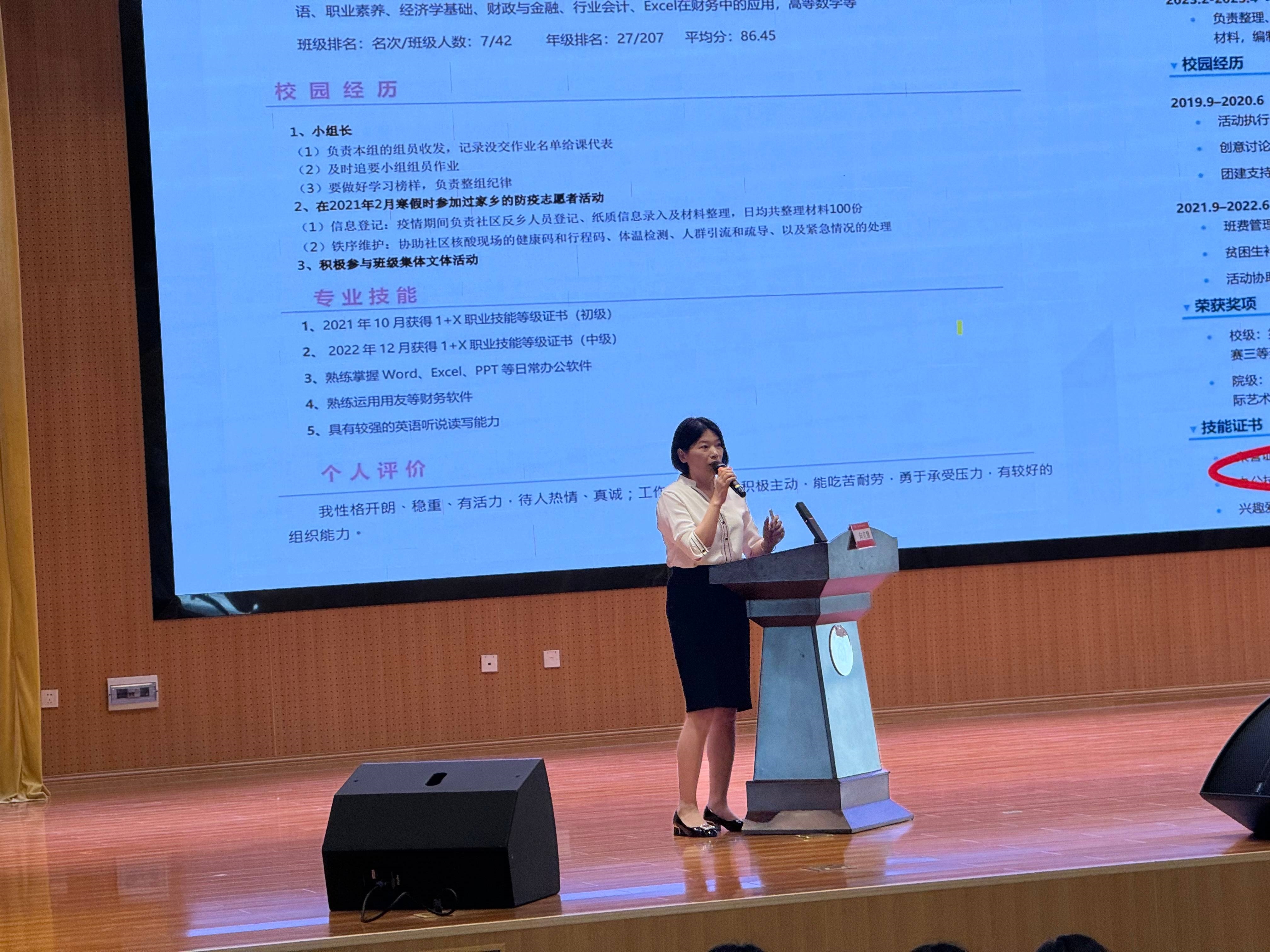 最后,校企合作企業代表進行了實習招聘宣講,詳細介紹了公司的發展歷程、業務范圍及崗位需求等信息,為學生們提供了豐富的實習與就業機會。學生們積極參與互動,對未來的職業發展充滿期待。同時企業也邀請了會計學院優秀畢業生上臺做經驗分享,分享了自己的求職經驗以及工作經驗,同學們深受啟發。