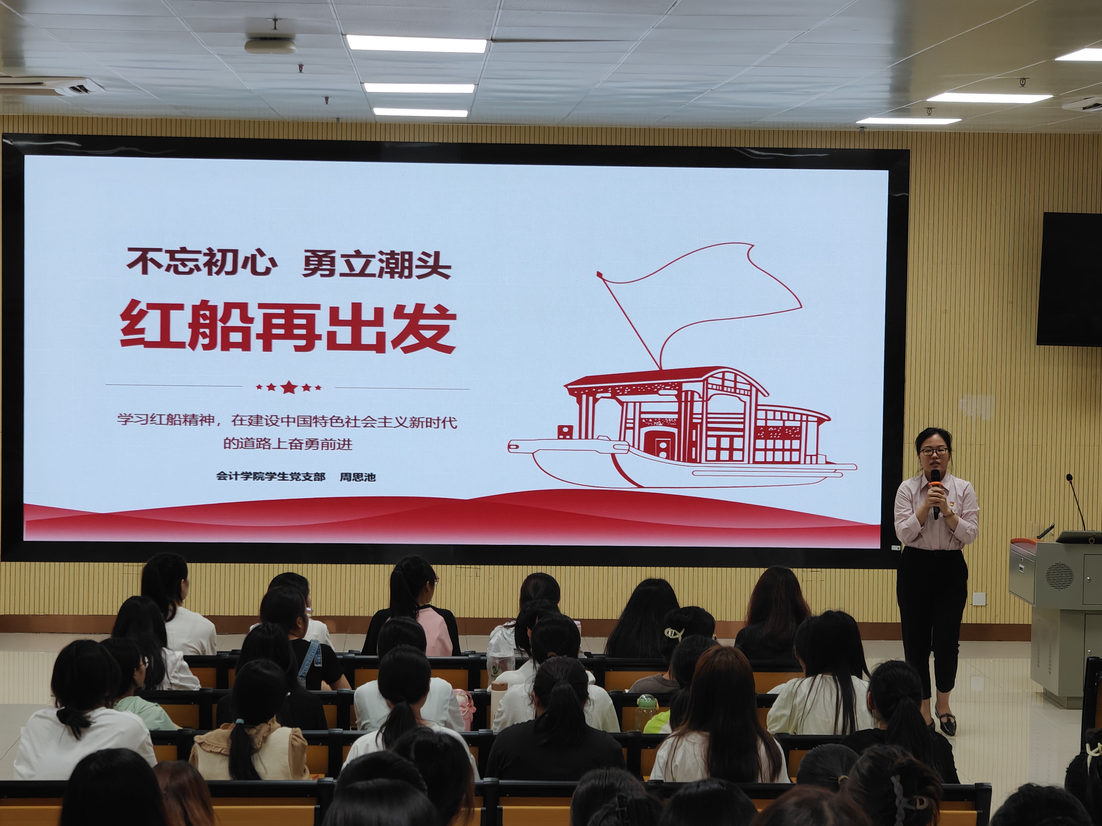 課程開始,周思池老師從紅船精神的內涵、紅船精神對我黨的重要意義、弘揚紅船精神,譜寫新時代的新篇章三個方面給大家講述了什么是紅船精神。紅船精神具有“開天辟地、敢為人先的首創精神”,“堅定理想、百折不撓的奮斗精神”,“立黨為公、忠誠為民的奉獻精神”。1921年,中國共產黨第一次全國代表大會在浙江嘉興南湖的一條游船(后稱“紅船”)上勝利閉幕,莊嚴宣告中國共產黨的誕生。從此,中國的新民主主義革命就有了堅強的領導者——中國共產黨。中國共產黨一直秉承紅船的創新精神,不斷開拓進取,帶領中國人民走向民族復興。周思池老師強調,紅船精神是重要精神航標,具有巨大的精神能量,在新時代的美好時期,弘揚和踐行革命紅船精神將更好地激勵當代青年大學生勇敢地擔當起時代賦予的歷史使命和社會責任,促使我們勇于創新、艱苦奮斗、無私奉獻,成長為實現中華民族偉大復興的堅實力量。