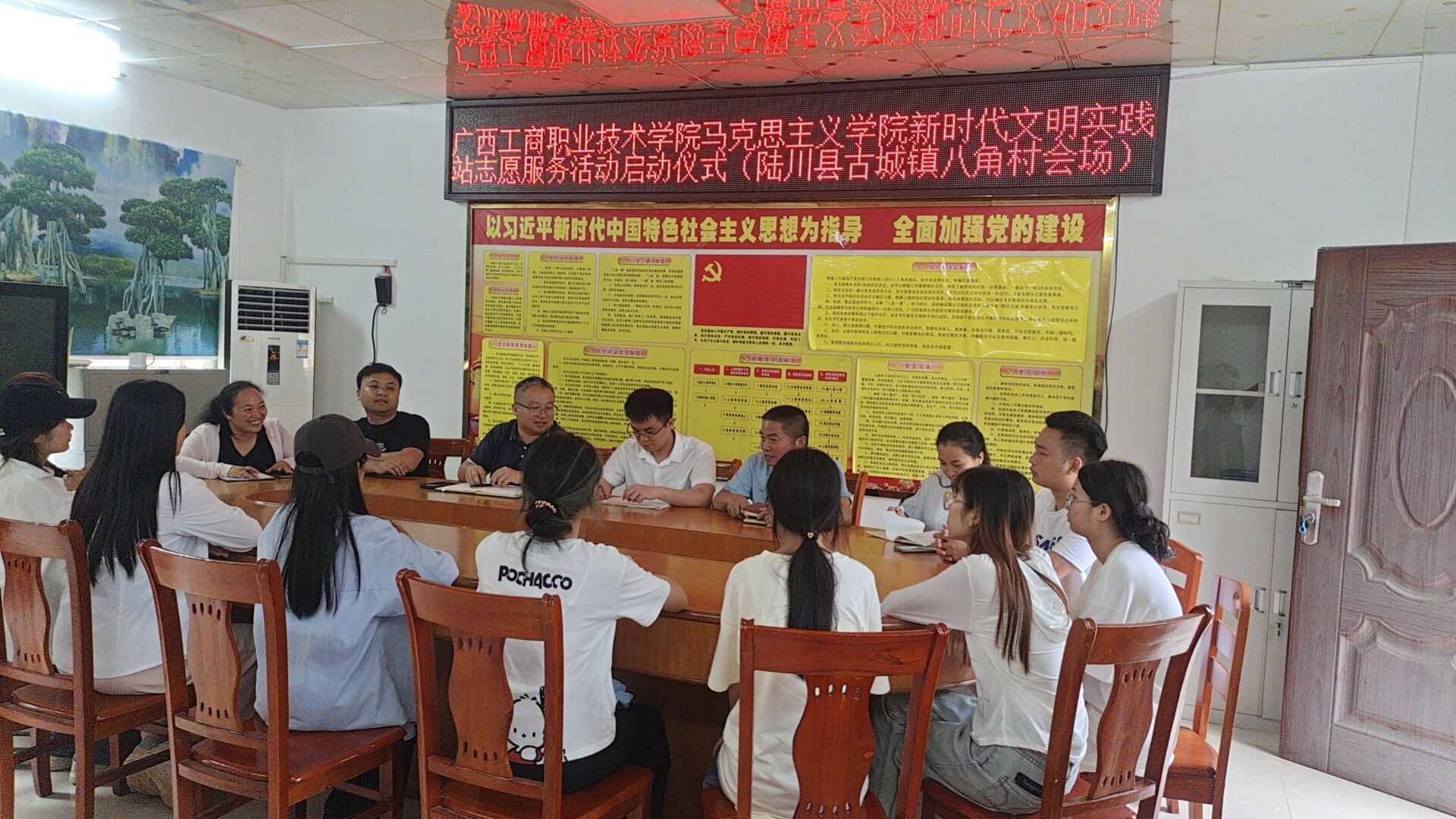 2024年7月8日,“共繪同心圓 鑄牢民族情”社會實踐團隊在馬克思主義學院新時代文明實踐站志愿者王開榮和黃士深老師的帶領下前往玉林市陸川縣古城鎮八角村深入開展大學生暑期“三下鄉”社會實踐活動。當天下午,實踐團隊在八角村二樓會議室舉行啟動儀式。參加啟動儀式的人員有古城鎮副鎮長陶科良、駐村第一書記鐘誠、村支書范善鈞、其他駐村工作隊員以及10名實踐團隊師生。啟動儀式由鐘誠書記主持。