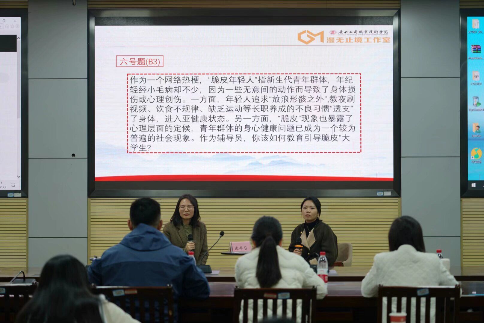 為進(jìn)一步提升我院輔導(dǎo)員的思政素養(yǎng)、業(yè)務(wù)能力與育人水平,幫助輔導(dǎo)員深入領(lǐng)悟和把握輔導(dǎo)員素質(zhì)能力大賽的比賽要領(lǐng),切實(shí)做好學(xué)校2025輔導(dǎo)員素質(zhì)能力大賽的備賽工作,13日上午經(jīng)貿(mào)學(xué)院鵬飛校區(qū)2119會(huì)議室舉辦輔導(dǎo)員素質(zhì)能力提升營暨2025年輔導(dǎo)員素質(zhì)能力大賽賽前培訓(xùn)。廣西職業(yè)技術(shù)學(xué)院學(xué)生工作處李榮榮老師、廣西建設(shè)職業(yè)技術(shù)學(xué)院海棠工作室宋景弘老師、廣西工商職業(yè)技術(shù)學(xué)院漫無止境輔導(dǎo)員能力建設(shè)工作室主持人郭曼老師受邀作專題輔導(dǎo)培訓(xùn)與大賽經(jīng)驗(yàn)分享,經(jīng)貿(mào)學(xué)院全體專職輔導(dǎo)員參加了培訓(xùn)。