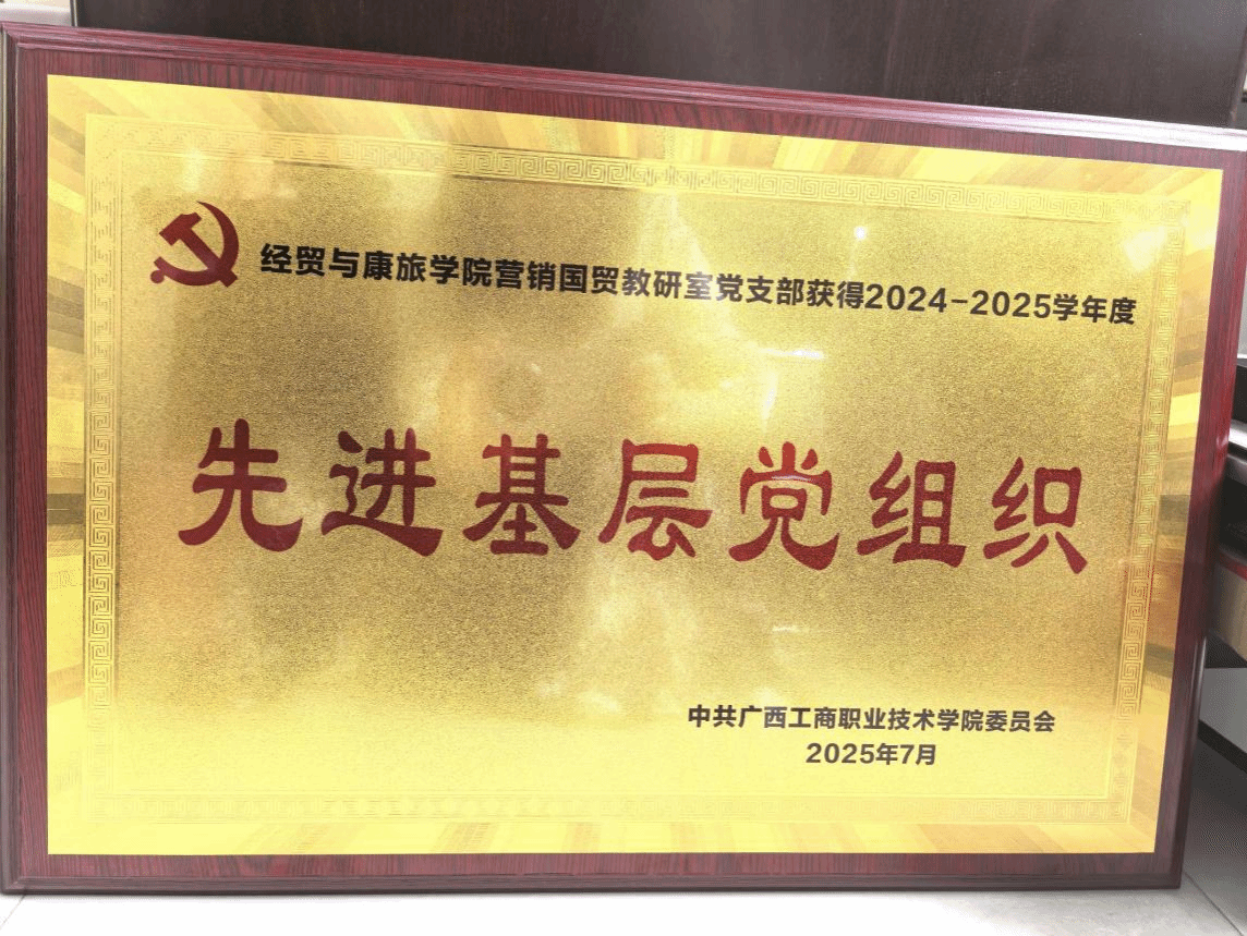 2025 年 7 月 1 日,在這個特殊的日子里,經(jīng)貿(mào)與康旅學院營銷國貿(mào)教研室被授予廣西工商職業(yè)技術(shù)學院2024-2025 學年度“先進基層黨組織”稱號。這一榮譽不僅是對教研室過去一年黨建工作的高度肯定,更是激勵全體成員繼續(xù)前行的強大動力。