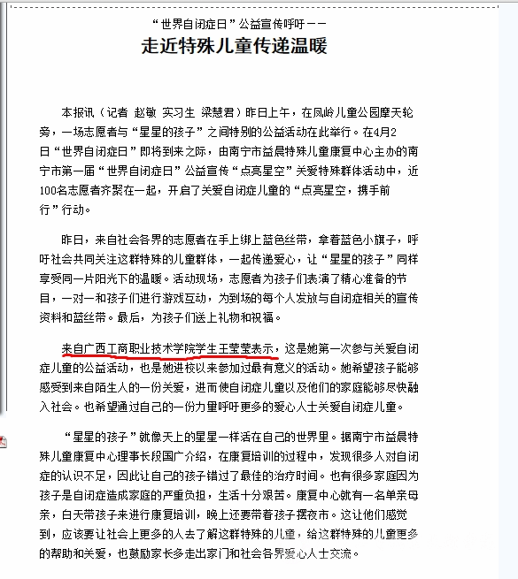 • 2015年3月29日,由南寧市益晨特殊兒童康復中心主辦南寧市民政局與南寧市殘疾人聯合會承辦的“點亮星空,攜手前行!”公益計劃——南寧市第一屆“世界自閉癥日”公益活動在南寧市鳳嶺兒童樂園舉行,我院紅十字會服...