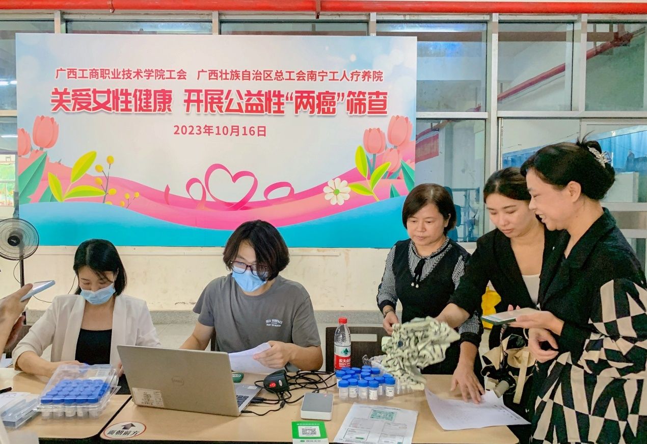 • 10月16日下午,學院與廣西壯族自治區總工會南寧工人療養院在鵬飛校區開展“關愛女性健康 開展公益性‘兩癌’?篩查”體檢服務,為學院一線女教職工體檢。(活動現場)開展公益性“兩癌 ”篩查服務活動是自治區總工...