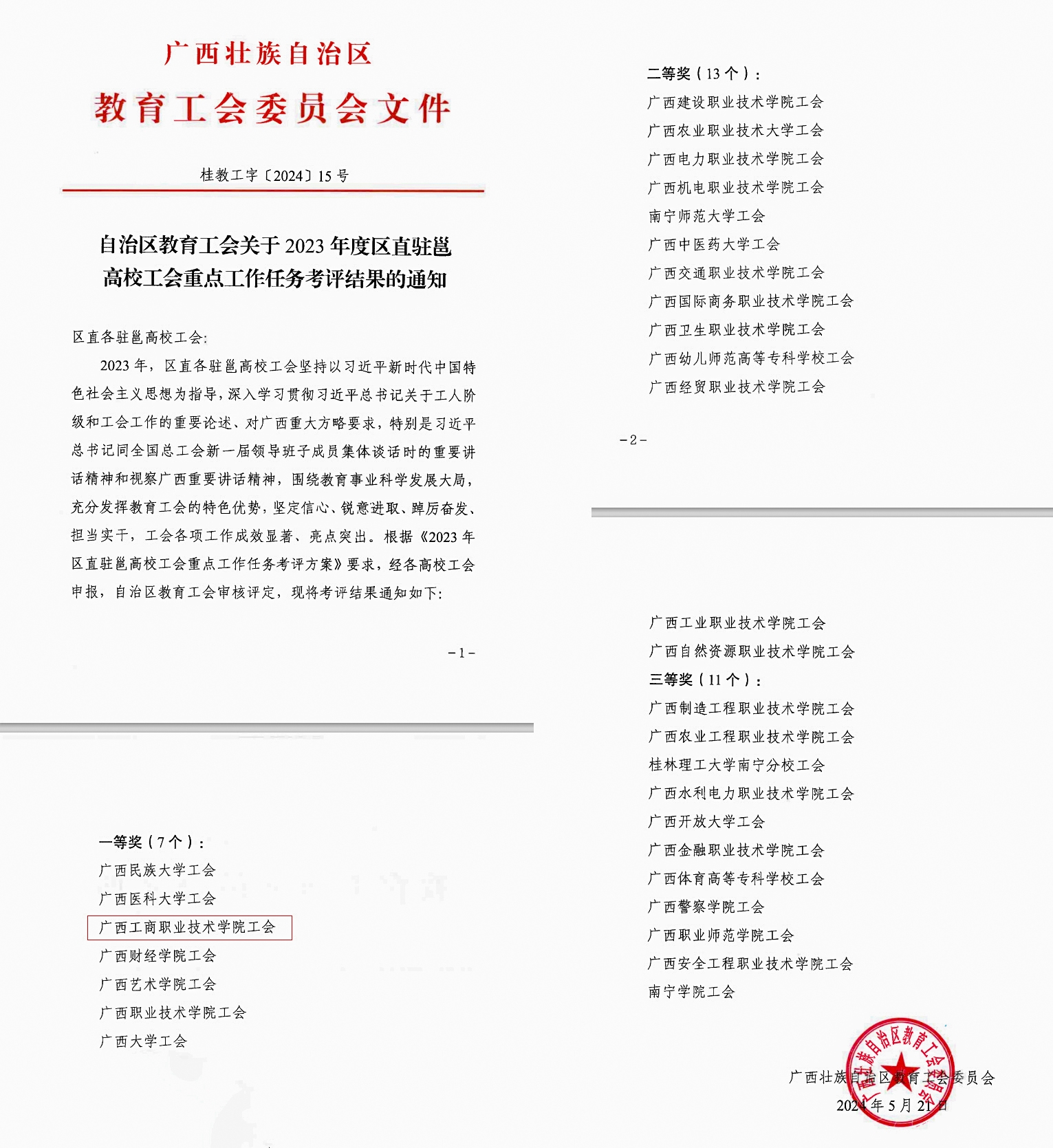 • 近日,自治區教育工會委員會公布了2023年度區直駐邕高校工會重點工作任務考評結果,我校榮獲一等獎,也是我校連續第二年度獲取該獎項,這是對學校長期以來致力于服務教職工、推動工會工作高質量發展的充分肯定。2...