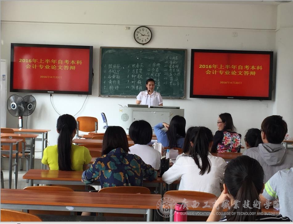 • 2016年4月22日下午及4月23日,繼續教育部在我院本部(鵬飛校區)第二教學樓開展2016年上半年自考專本銜接考生畢業論文答辯工作。此次畢業答辯涉及就讀主考學校為廣西財經學院自考本科的會計學專業、工商管理專業...